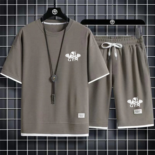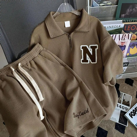 Tracksuit Short Sleeve Set Waffle Cotton Breathable Plaid Fabric Mens Casual Two Piece Set Fashion Sports Suit