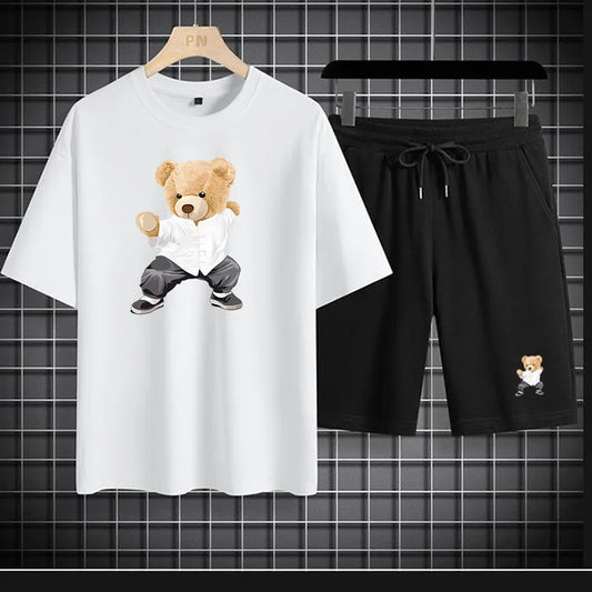 Men's Cotton Bear Print T-Shirt and Shorts Set: Comfortable and Stylish for Fitness and Casual Wear.